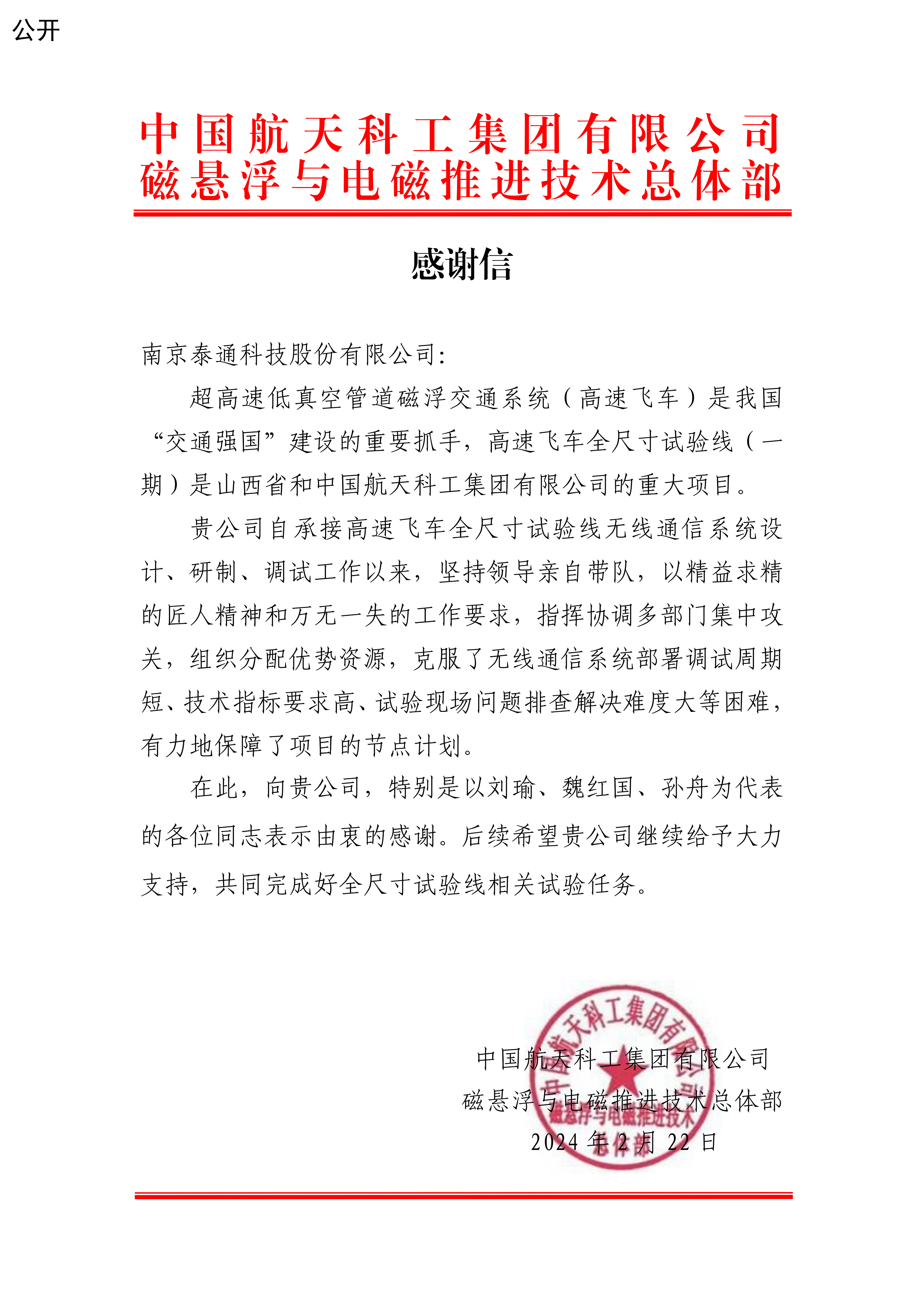 喜訊!泰通科技收到中國航天科工集團(tuán)的感謝信